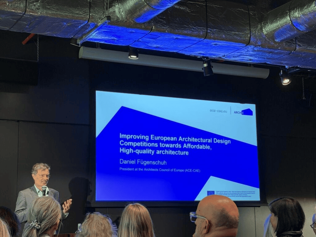 ARCH-E конференцијата, одржана на 23 април во објектот „Royale Belge“, се фокусираше на улогата на архитектонските конкурси (ADC) во унапредување на архитектонскиот квалитет и иновациите, како и нивниот придонес кон развој на одржлива и висококвалитетна изградена средина. Настанот обедини архитекти, креатори на политики, јавни институции и претставници од градежниот сектор, кои разменија мислења и искуства за унапредување на конкурсните практики низ Европа.