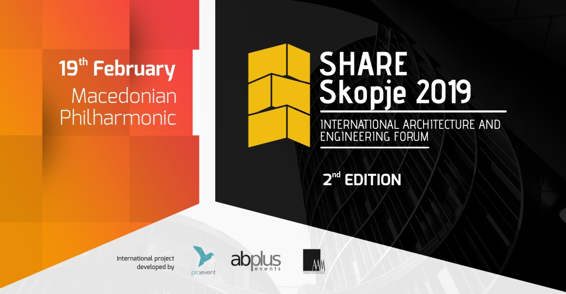 Комората на овластени архитекти и овластени инженери и културната асоцијација PRO Еvent имаат чест да Ве поканат да учествувате на SHARE Skopje 2019, Меѓународен Форум за архитектура и инженерство кој ќе се одржи во Филхармонија Скопје. На форумот ќе се соберат преку 250 архитекти, урбанисти, проектанти, проектанти на осветлување, инженери, менаџери на недвижнини, претставници од јавни институции, студенти со иновативни решенија во областа на градежништвото и други професионалци поврзани со архитектурата.