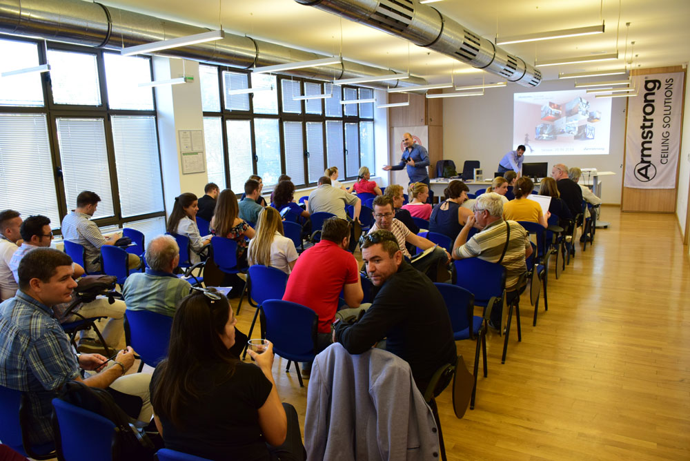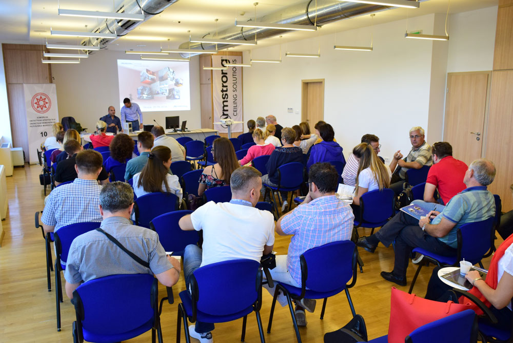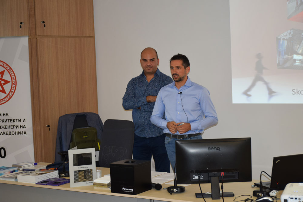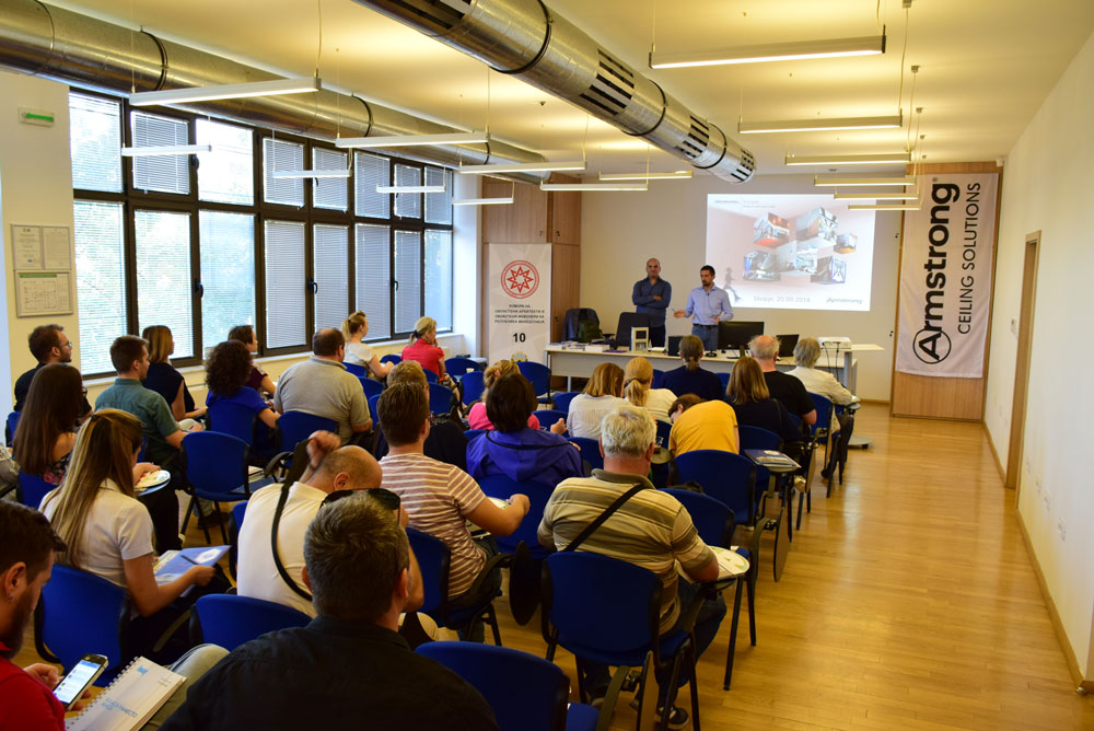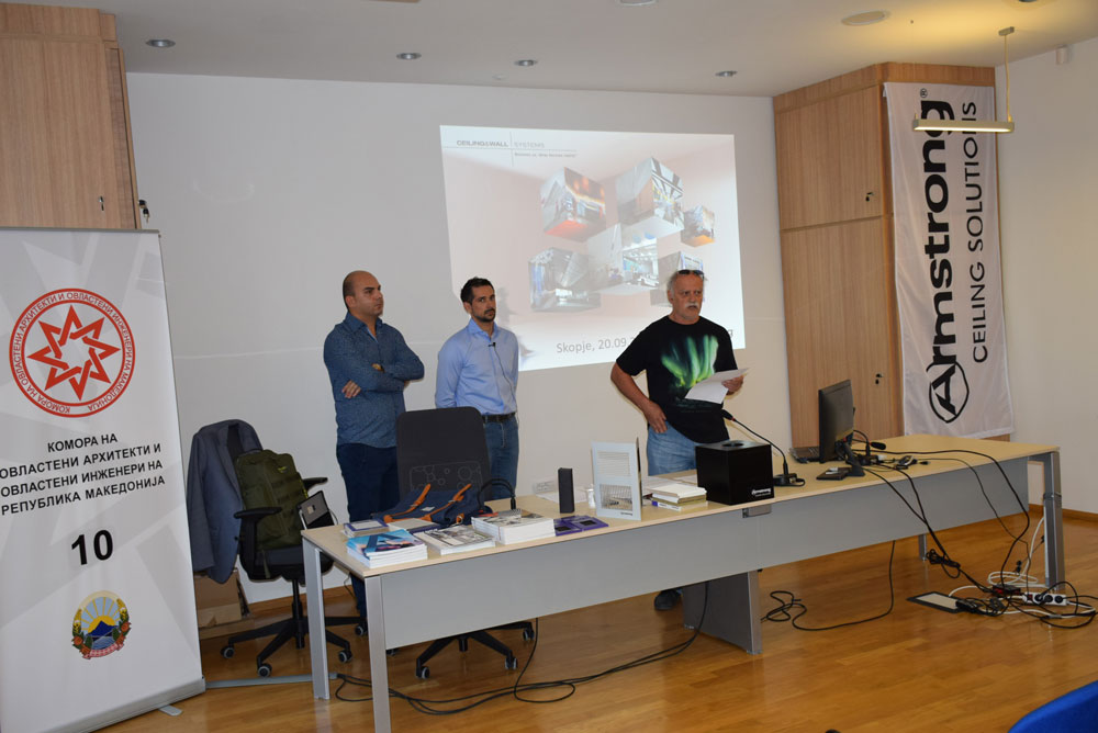 Предавањето беше поделено во три дела. Во првиот дел беше промовиран современиот пристап на проектирање и изградба со материјалите од Armstrong ceilings, во вториот дел беше презентирано во кои типови објекти е препорачливо да се вградуваат вакви плафонски системи и во третиот дел беа презентирани моделите и начините со кои фирмата Armstrong ceilings може да им помогне на архитектите при проектирањето на ваквите плафонски системи.