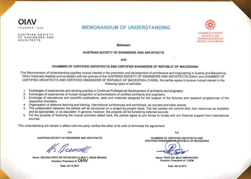 Комората на овластени архитекти и овластени инжери на Република Македонија и Австриската асоцијација на инженери и архитекти имаат потпишано договор за взаемно признавање на овластувањата издадени од коморите.