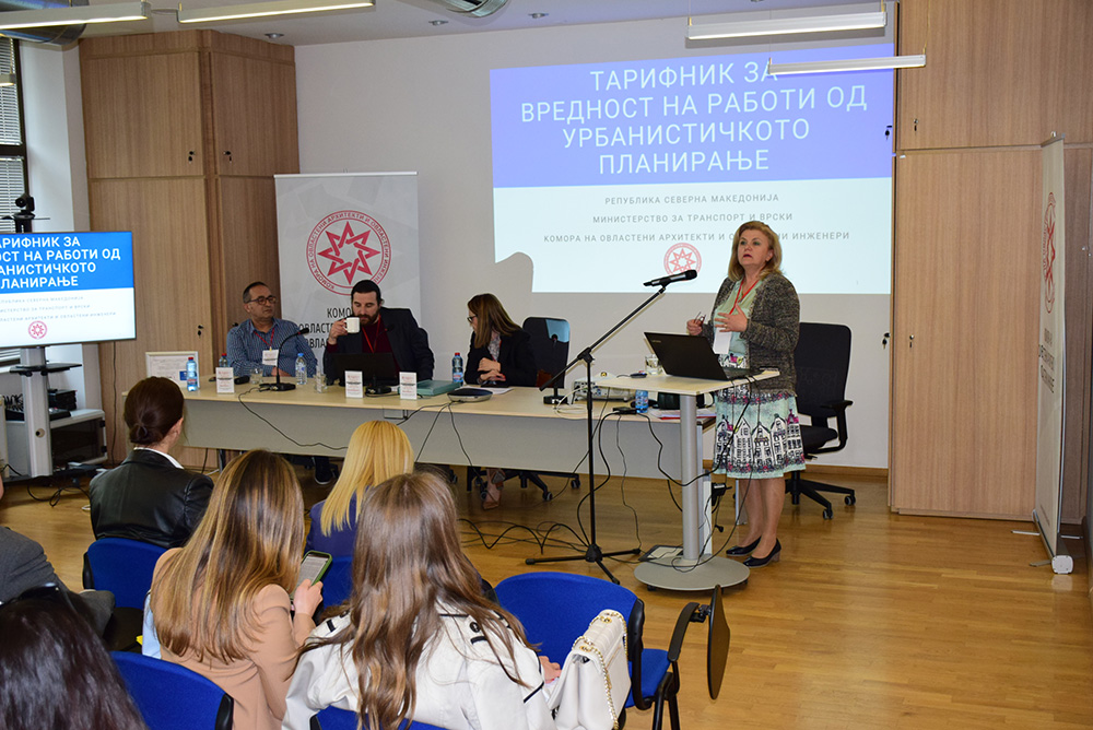 На почетокот со поздравен говор се обрати м-р Кристинка Радевски, претседател на Комората ОАИ, а во продолжение според агендата, свои излагања имаа: Михаел Димитровски, диа, раководител на Одделение на урбанисти и планери; Ана Ѓорѓиоска, Министерство за транспорт и врски, Советник за урбанизам и градежни работи; Д-р Душица Трпчевска Анѓелковиќ, диа, член на Одделение на урбанисти и планери при КОАИ, Раководител на сектор за просторно планирање при Агенцијата за планирање на просторот; Дурим Фетаху, диа, член на Одделение на урбанисти и планери при КОАИ, Раководител на сектор за урбанизам при Општина Дебар; Д-р Жаклина Ангеловска, диа, член на Одделение на урбанисти и планери при КОАИ, изработувач на Тарифникот и Калкулаторот и Илина Лалкова, диа, Министерство за транспорт и врски, помошник раководител на Сектор за уредување на просторот.