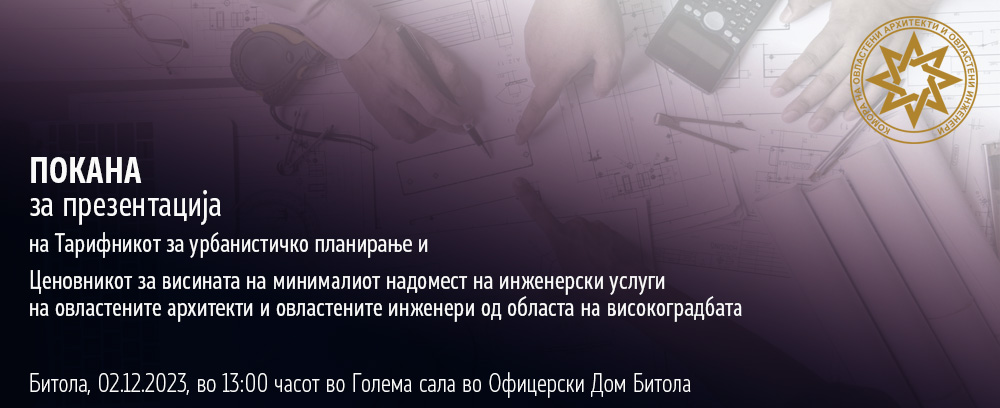 Во рамките на Втората Годишна средба на архитекти и архитекти урбанисти 2023, на 2 декември 2023 година со почеток во 13 часот, во Големата сала во Офицерски Дом Битола, ќе се одржи презентација на Тарифникот за урбанистичко планирање и Ценовник за висината на минималниот надомест на инженерски услуги на овластените архитекти и овластените инженери од областа на високоградбата.