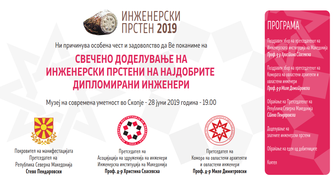 На 28 јуни 2019 година, на платото на Музејот на современа уметност во Скопје ќе се одржи Свечено доделување на инженерски прстени на најдобрите дипломирани инженери за 2019 година.
