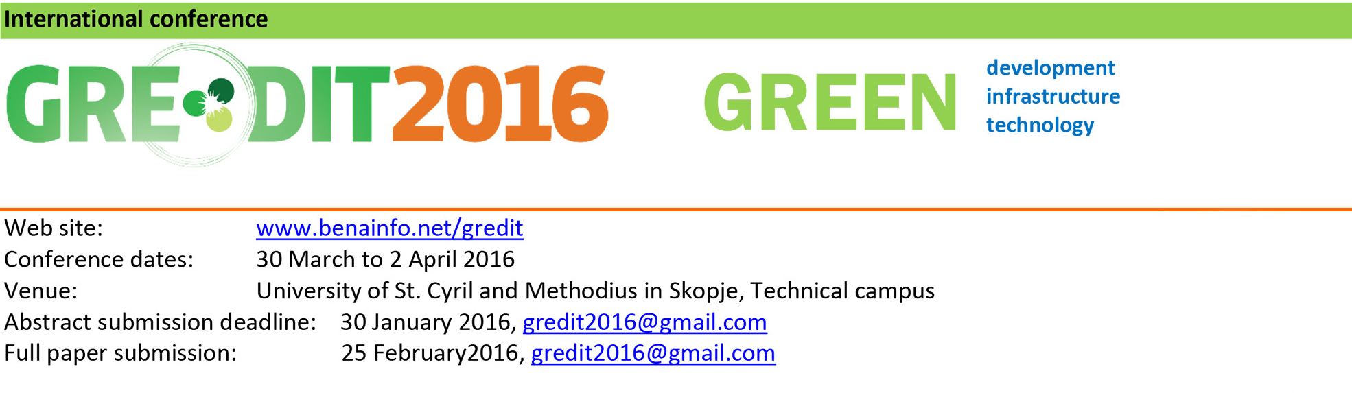 Рокот за поднесување на абстракти за трудови е 30 Јануари 2016 година. Темата на конференцијата е ‘Зелен развој на инфраструктура и технологија’, а селектираните трудови ќе се објават во реномирани светски журнали (Thomson Scientific и останати).