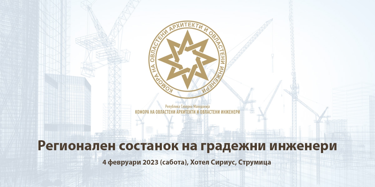 На 4 февруари 2023 година (сабота), во Хотел Сириус, Струмица со почеток во 10.30 часот, ќе се одржи Прва регионална струкова средба на градежни инженери.