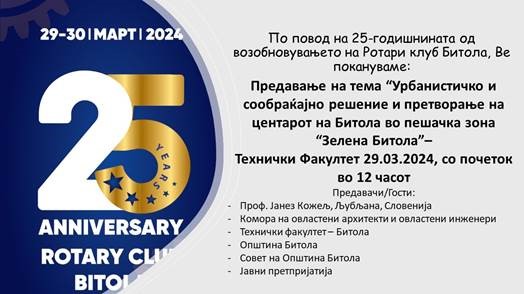 Во амфитеатарот на Техничкиот факултет Битола во петок на 29.03.2024 година, со почеток во 12 часот, ќе се одржи предавање на проф. Јанез Кожељ од Словенија, на тема „Претварање на центарот на урбаните средини во пешачка зона“. Идејата на предавањето е да го пренесе неговото искуство од претварањето на центарот на Љубљана во пешачка зона.