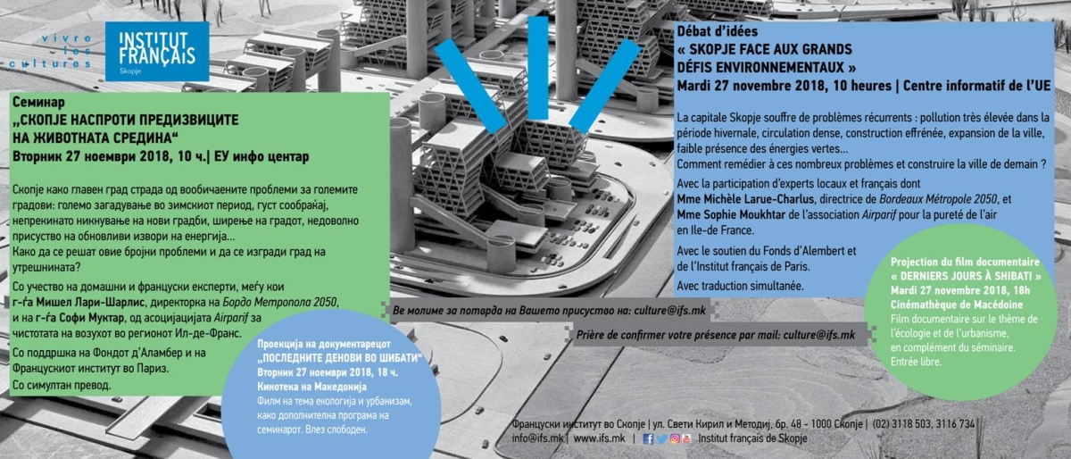 Во ЕУ инфо центарот во Скопје на 27 ноември, со почеток од 10 часот, ќе се одржи семинарот „Скопје наспроти предизвиците на животната средина“. На настанот ќе учествуваат домашни и француски експерти, меѓу кои и Мишел Лари – Шарлис, директорка на Бордо Метропола 2050 и Софи Муктар, од асоцијацијата Airparif за чистотата на воздухот во регионот Ил – де – Франс. Истиот ден, во Кинотека на Македонија, со почеток од 18 часот, ќе се одржи проекција на документарниот филм „Последните денови во Шибати“.