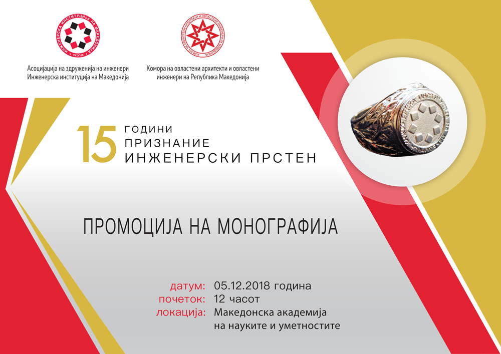 На 5 декември 2018 година, со почеток во 12 часот, во големиот амфитеатар на МАНУ, ќе се одржи промоција на монографијата 15 години - признание Инженерски прстен.